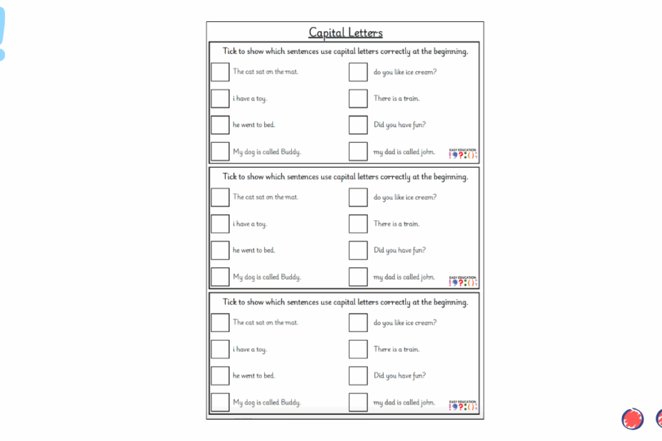 This activity helps children practise identifying sentences that use capital letters correctly. Pupils are asked to tick the correct sentences which reinforces their understanding of sentence accuracy in a simple and engaging way. It is ideal for use as a… Read More »Capital Letter Check 10