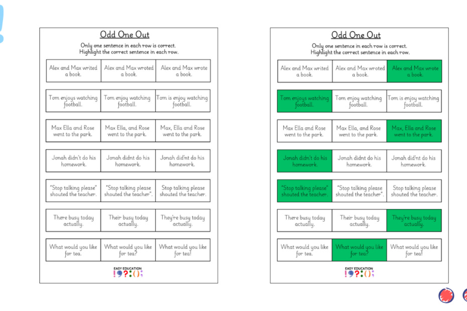 Our ‘Odd One Out’ activities are designed to sharpen children’s grammar and punctuation skills in a fun, engaging way. Each row of sentences challenges pupils to identify the correctly punctuated option, encouraging careful reading, attention to detail and critical thinking.… Read More »Odd One Out 8