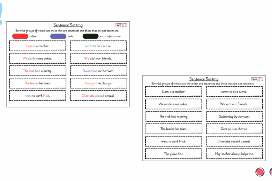 These sentence sorting activities are designed to help children develop a secure understanding of what makes a complete sentence. Rather than focusing on punctuation or correction, pupils sort groups of words into sentences and not sentences, encouraging them to think… Read More »Sentence Sorting 10