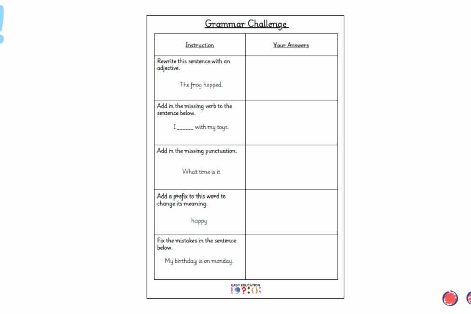 These Grammar Challenges provide quick, targeted activities to strengthen key grammar, punctuation and sentence skills. Each challenge encourages children to think carefully about how they can improve sentences, use correct grammar and make confident writing choices. Perfect for lesson starters,… Read More »Grammar Challenge 2