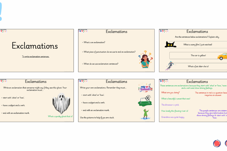 This resource pack helps children recognise and write the four main types of sentences: statements, questions, commands and exclamations. The PowerPoint introduces each type clearly with simple definitions, examples and tips on spotting key features like question marks, bossy verbs and exclamation… Read More »Sentence Types