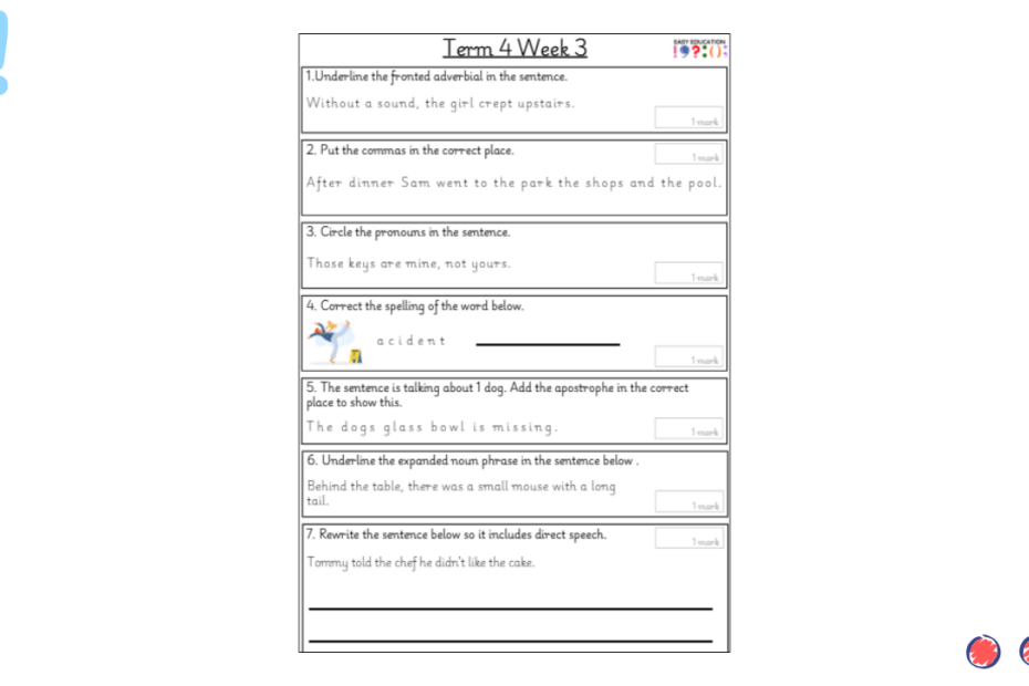 Our weekly tests are designed to provide children with regular opportunities to practise key grammar, punctuation and spelling skills. Each sheet includes a carefully chosen set of short questions that cover essential curriculum objectives, reinforcing knowledge through consistent practice. Alongside… Read More »Term 3 Week 5 Weekly Test