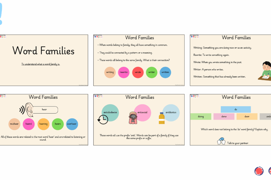 This resource teaches children how words are connected through a shared root, helping them build vocabulary, spelling awareness and confidence in word formation. The PowerPoint introduces the concept clearly, using examples, partner talk and odd-one-out challenges to deepen understanding. Pupils… Read More »Word Families