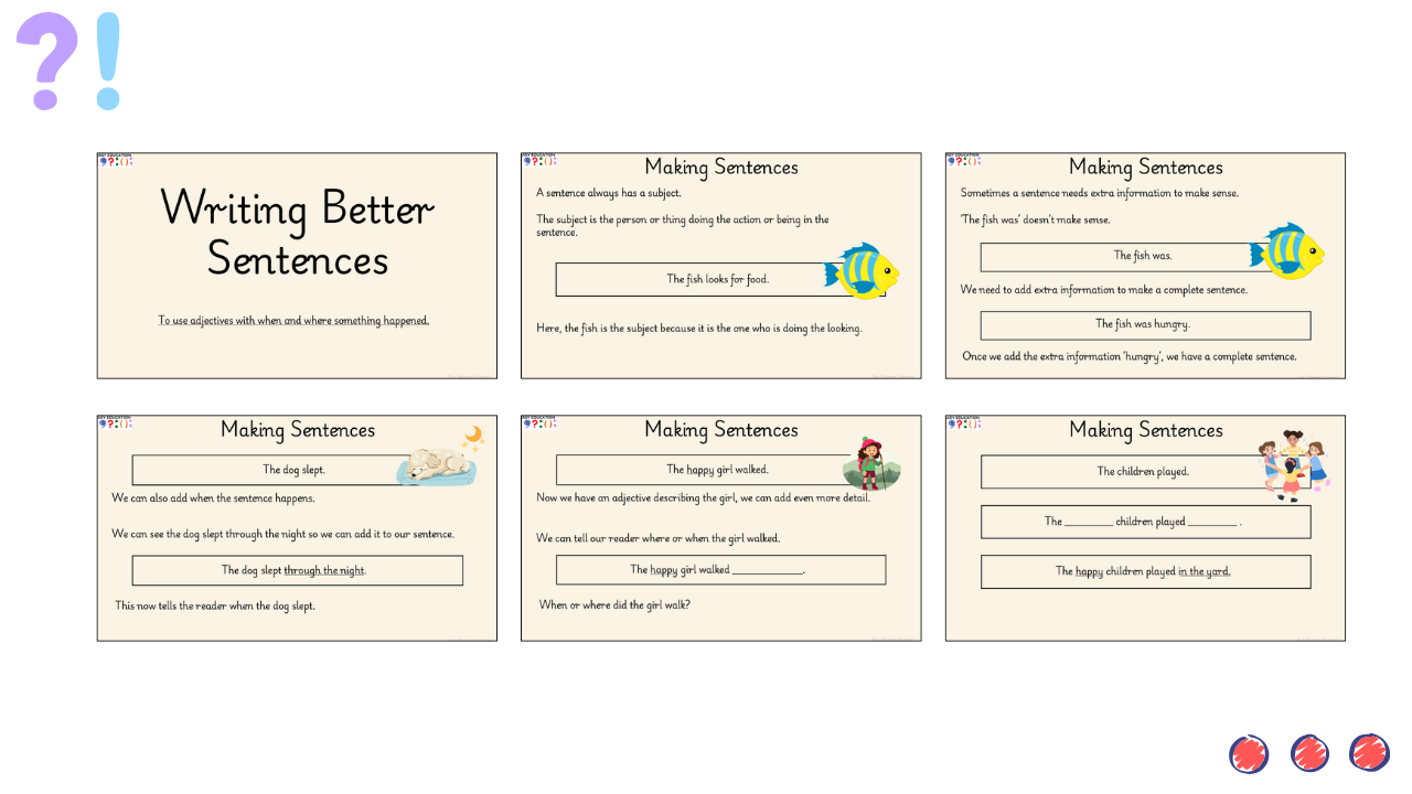 In this lesson, children bring together everything they have learned about writing simple sentences and begin extending them with meaningful detail. Pupils build on their understanding of subjects, verbs, and adjectives by learning how to add where or when an event happened. Through clear, step-by-step modelling, children see how adjectives and when/where phrases help create richer, more interesting sentences. The lesson finishes with differentiated activities where pupils use picture prompts to write their own expanded sentences, choosing an adjective and either a when-phrase or a where-phrase to show a deeper understanding of sentence construction.