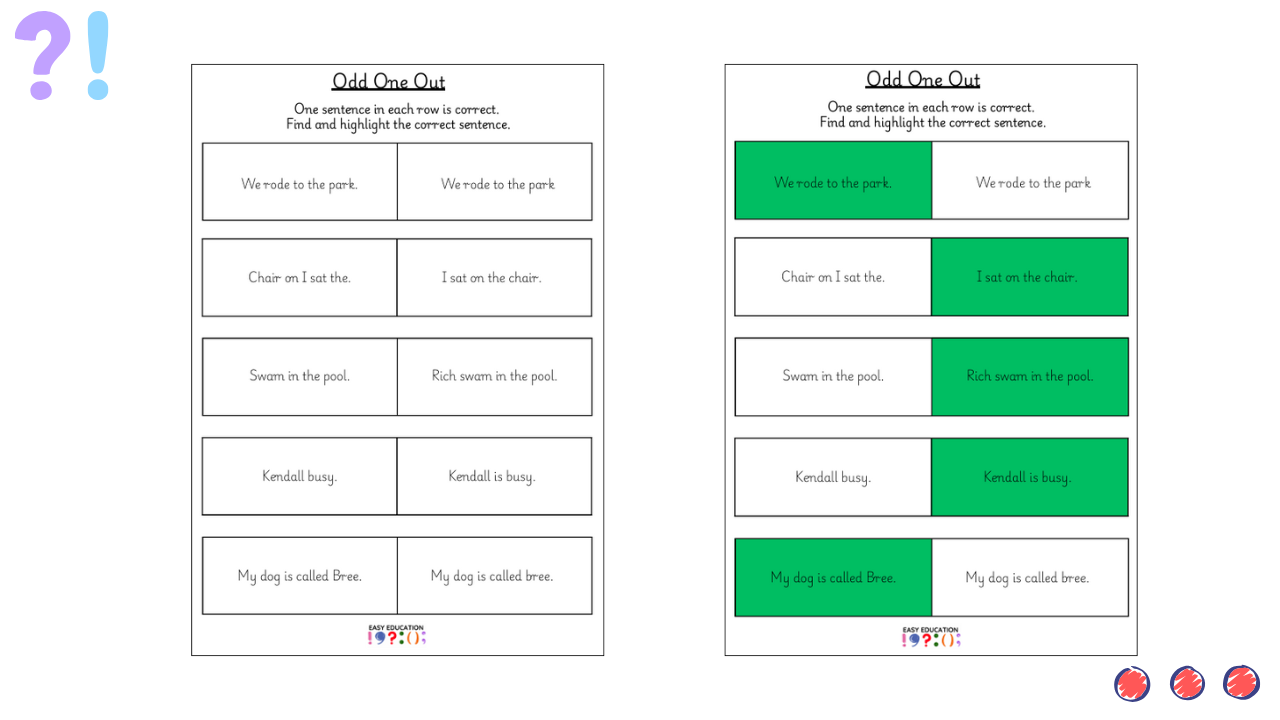 Our ‘Odd One Out’ activities are designed to sharpen children’s grammar and punctuation skills in a fun, engaging way. Each row of sentences challenges pupils to identify the correctly punctuated option, encouraging careful reading, attention to detail and critical thinking.