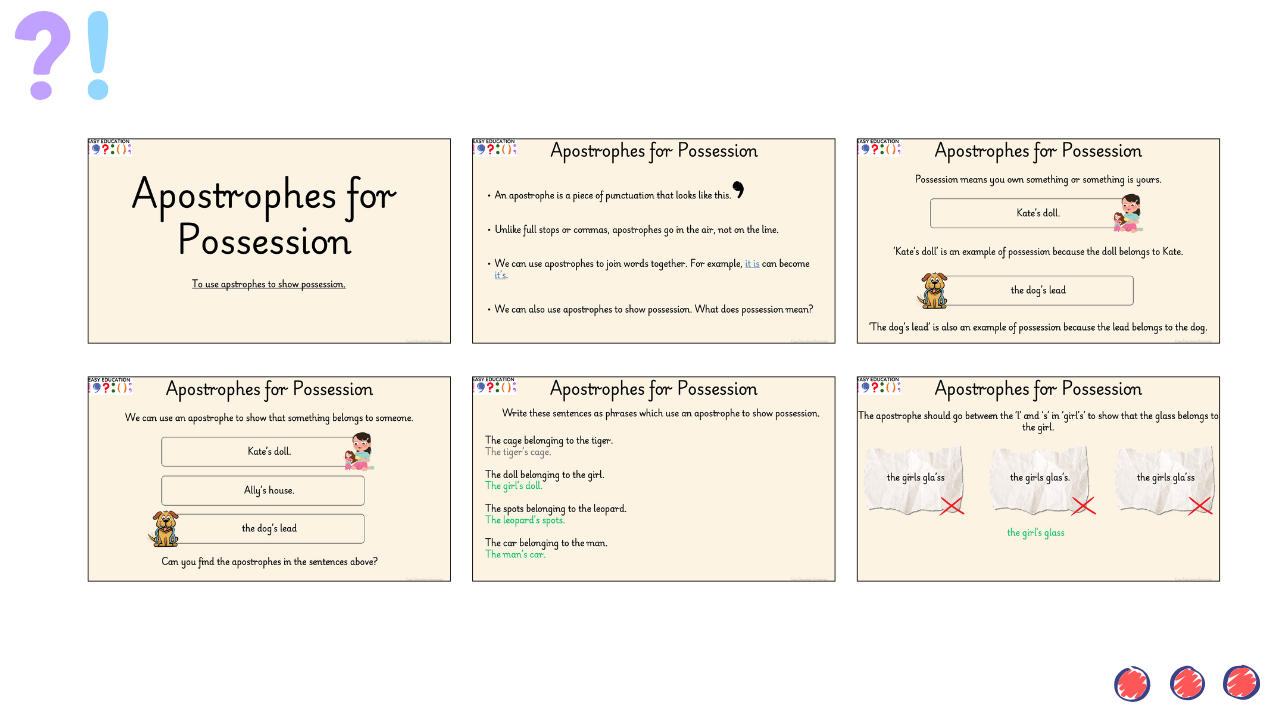 The perfect introduction for using apostrophes to show that something belongs to someone or something. The PowerPoint explains what possession means, where to place the apostrophe and gives clear examples to follow. It also includes common mistakes for pupils to spot and fix. From practising how to add missing apostrophes, to rewriting phrases accurately and creating their own examples, these resources keep explanations clear and straightforward while helping pupils use this punctuation correctly. They are perfect for introducing or revisiting the skill in a simple, step-by-step way.