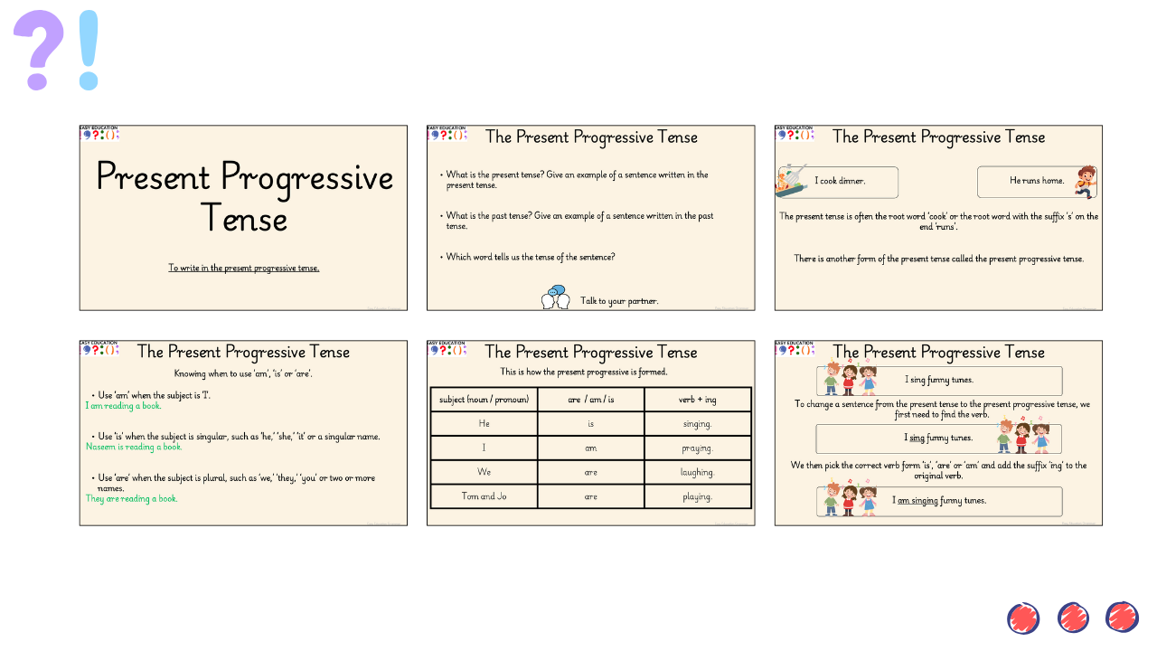 This resource pack introduces children to the present progressive tense — used to show that something is happening right now. The PowerPoint explains how to build these sentences using is, are or am with a verb ending in ing and clearly shows the difference between the present progressive and the simple present tense. Pupils are guided step-by-step through sentence transformations and common errors with plenty of examples and talk opportunities built in. The tasks provide scaffolded practice, starting with table-based sentence building and moving on to rewriting full sentences. These activities help children build confidence using the tense in their own writing.