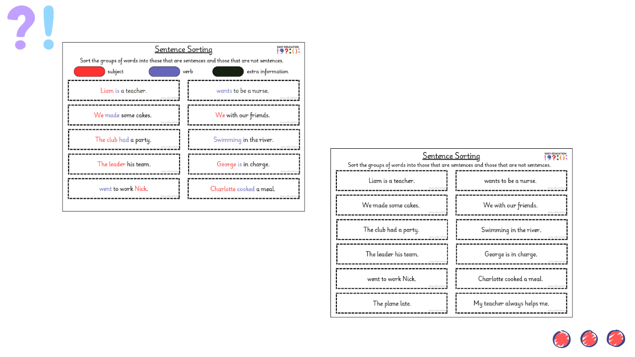 These sentence sorting activities are designed to help children develop a secure understanding of what makes a complete sentence.