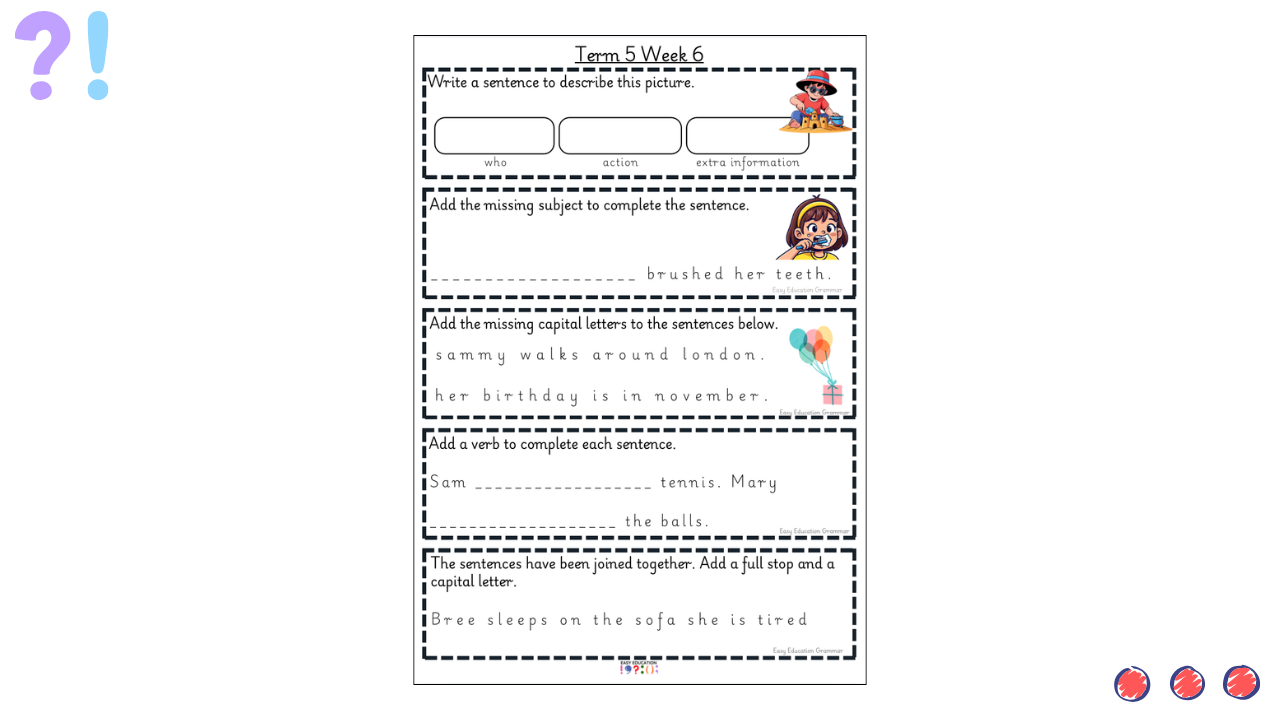 To keep the focus firmly on sentence sense and sentence demarcation, other punctuation is not introduced at this stage. These starters are designed to support consistency, confidence and fluency before moving on to more complex sentence work.