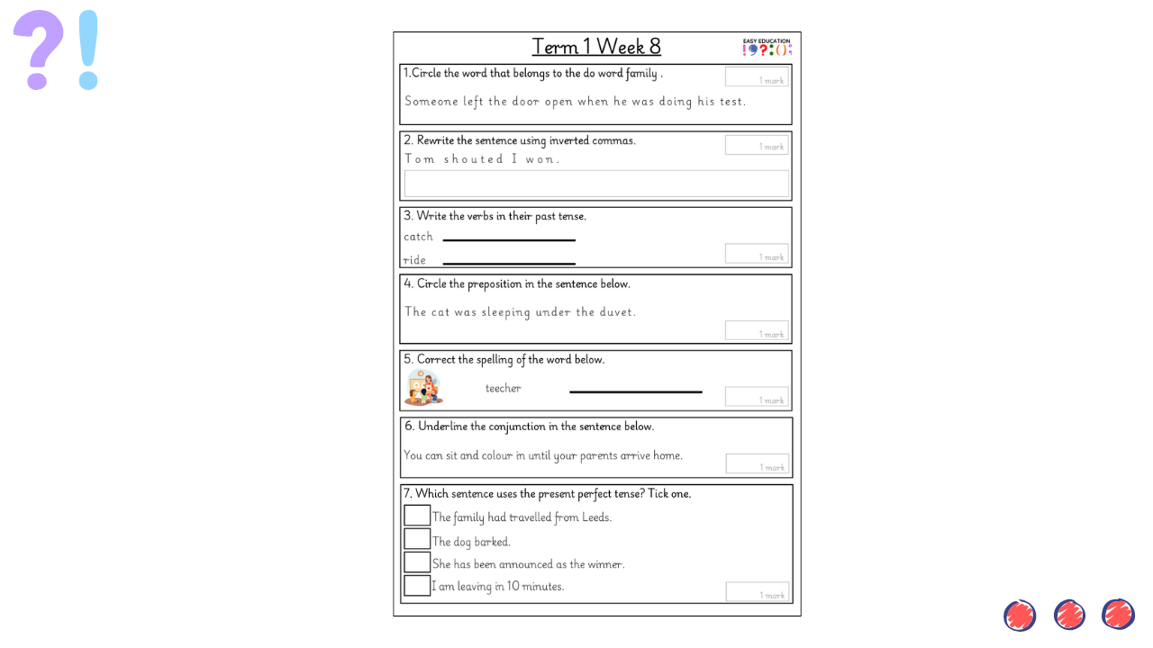 Our weekly tests are designed to provide children with regular opportunities to practise key grammar, punctuation and spelling skills. Each sheet includes a carefully chosen set of short questions that cover essential curriculum objectives, reinforcing knowledge through consistent practice.