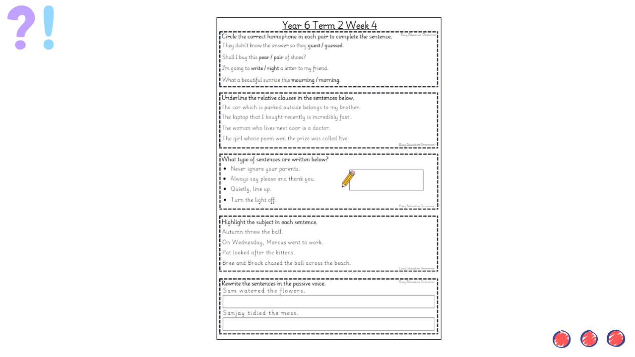 These weekly starters provide short, focused activities designed to reinforce grammar, punctuation and sentence structure skills. They are ideal for settling pupils at the start of an English lesson, revisiting prior learning and building confidence in applying key writing skills.