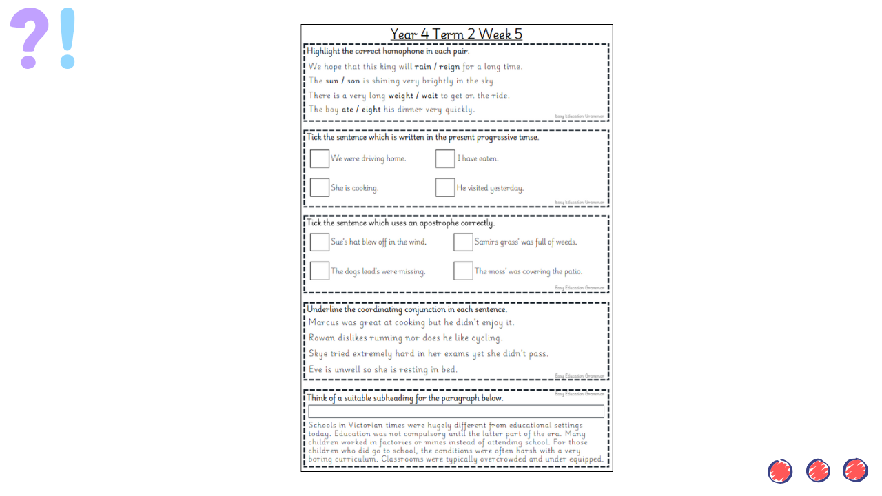 These weekly starters provide short, focused activities designed to reinforce grammar, punctuation and sentence structure skills. They are ideal for settling pupils at the start of an English lesson, revisiting prior learning and building confidence in applying key writing skills.