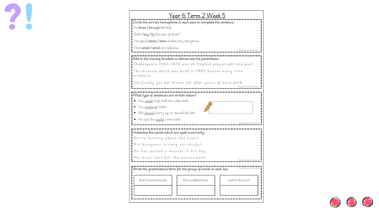 These weekly starters provide short, focused activities designed to reinforce grammar, punctuation and sentence structure skills. They are ideal for settling pupils at the start of an English lesson, revisiting prior learning and building confidence in applying key writing skills.