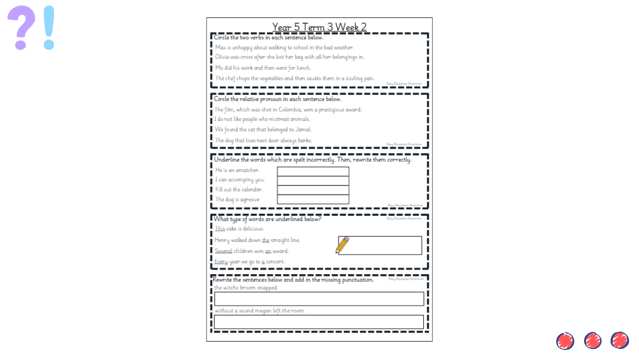 These weekly starters provide short, focused activities designed to reinforce grammar, punctuation and sentence structure skills. They are ideal for settling pupils at the start of an English lesson, revisiting prior learning and building confidence in applying key writing skills.