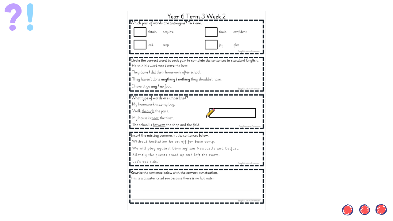 These weekly starters provide short, focused activities designed to reinforce grammar, punctuation and sentence structure skills. They are ideal for settling pupils at the start of an English lesson, revisiting prior learning and building confidence in applying key writing skills.
