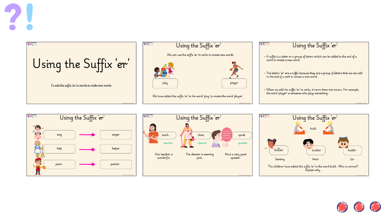 A Year 1 resource pack for teaching how to add the suffix ‘er’ to root words. The interactive PowerPoint shows how ‘er’ can be added to words to make new ones with clear examples and opportunities to practise. The accompanying task sheet reinforces the skill through word rewriting and sentence writing activities. A simple, engaging way to introduce children to building new words with suffixes.