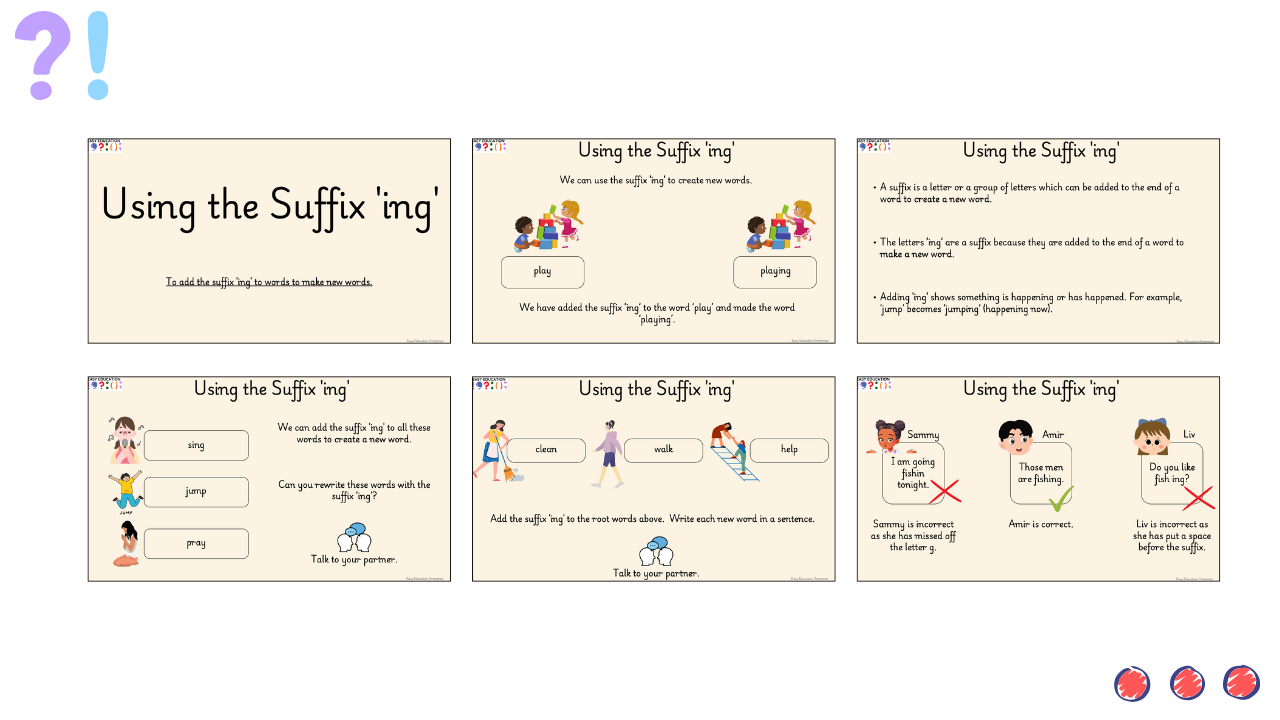 The interactive PowerPoint which explains what a suffix is, shows how ‘ing’ can be added to words to make new ones and demonstrates that it often describes something happening now. The accompanying task sheet provides opportunities to practise by rewriting words with ‘ing’, identifying which words can take the suffix, and completing sentences with the correct form. A clear, simple and practical way to introduce this common suffix.