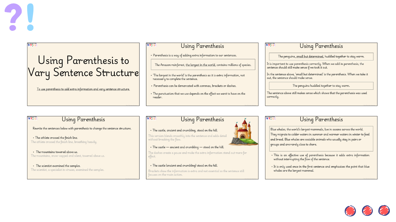Through clear modelling, guided practice, and independent tasks, pupils move from identifying parenthesis to applying it confidently in their own sentences. The lesson also explores when parenthesis should not be overused, helping pupils develop control and cohesion in their writing.