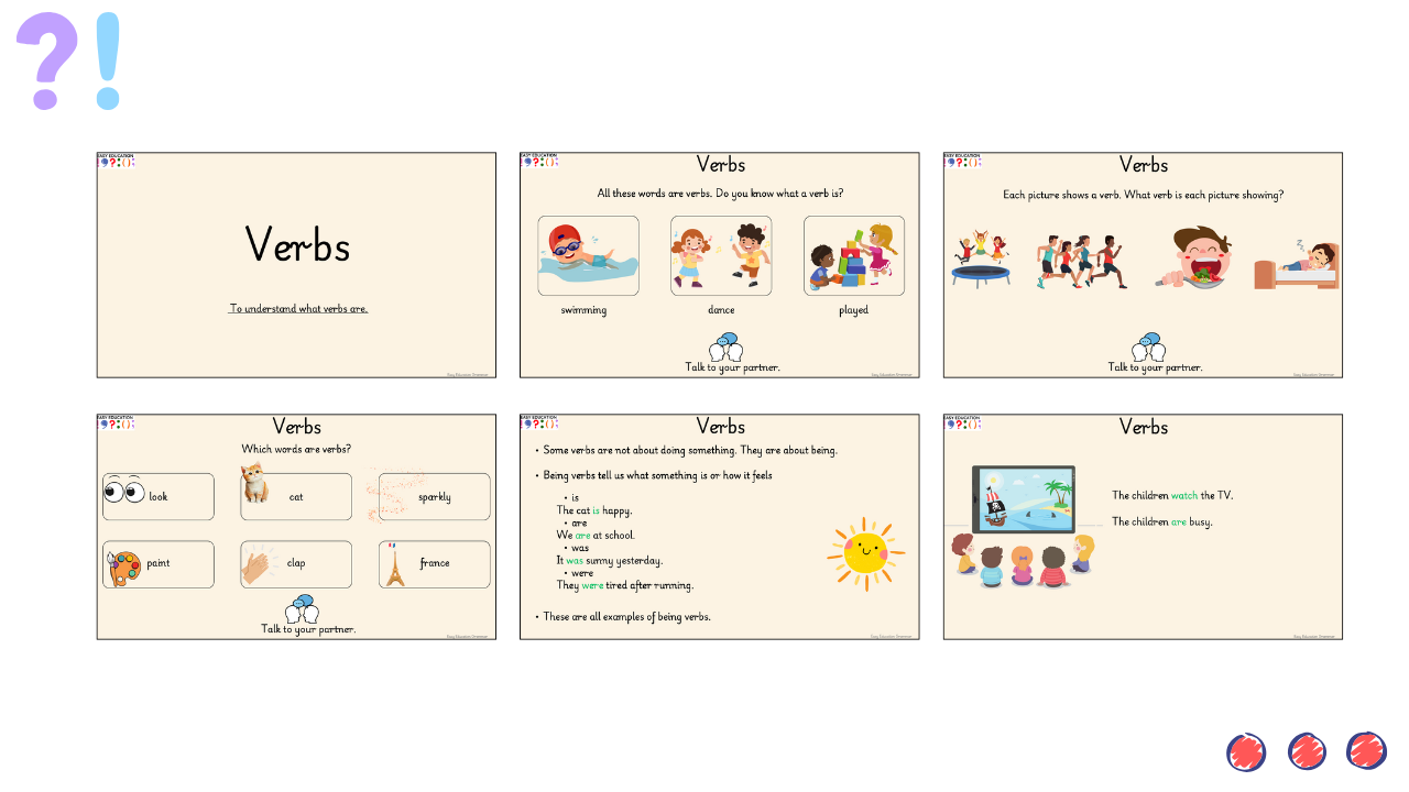 A clear and engaging Year 1 resource pack for introducing verbs. The PowerPoint teaches children that verbs are doing or being words, using relatable examples and visuals. Activities include identifying verbs in context, matching verbs to pictures and using verbs in their own sentences. A great resource for developing early grammar knowledge and sentence-building skills.