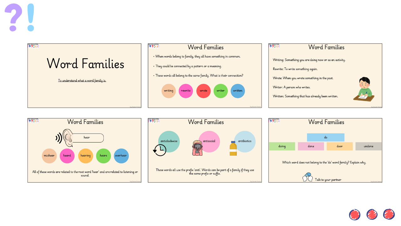 This resource teaches children how words are connected through a shared root, helping them build vocabulary, spelling awareness and confidence in word formation. The PowerPoint introduces the concept clearly, using examples, partner talk and odd-one-out challenges to deepen understanding. Pupils explore how prefixes, suffixes and tenses create related words and apply this knowledge in guided tasks. Activities range from matching and sorting to creating their own word families.